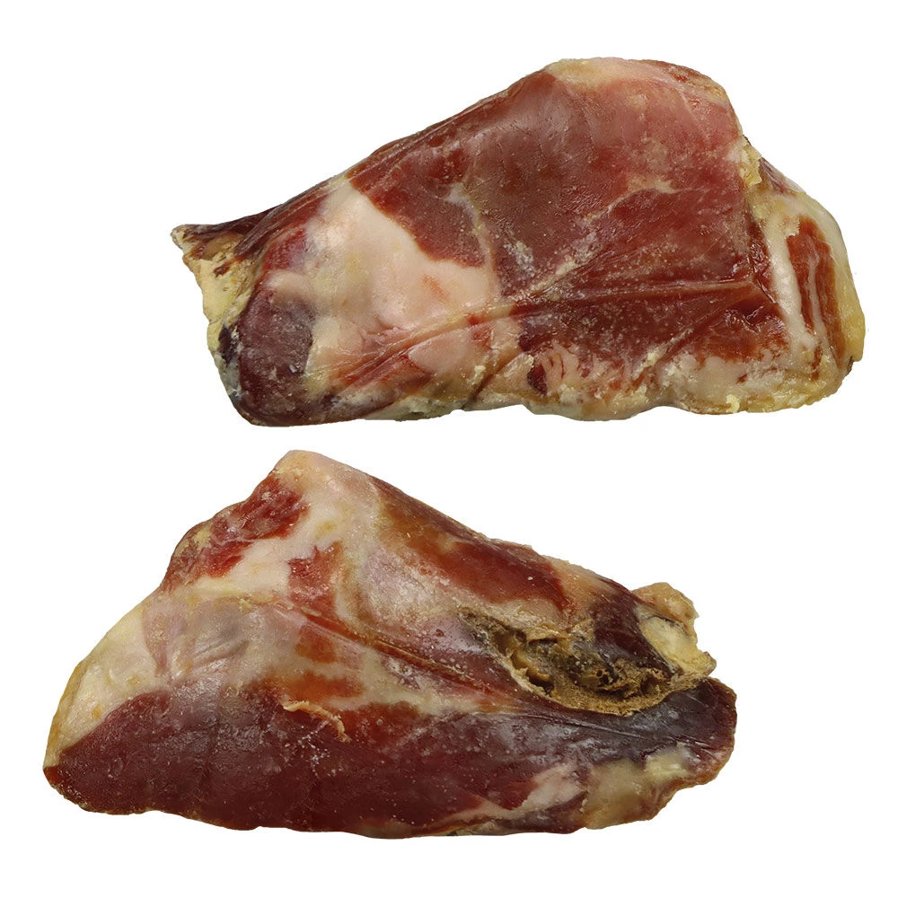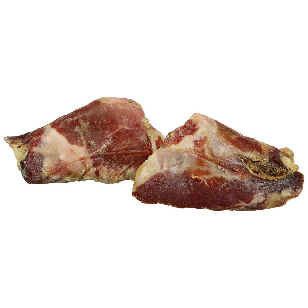 Verse (niet gedroogde) stukjes fijne Italiaanse ham. Deze heerlijke stukjes vlees bevatten de vrij zachte, splintervrije knieschijf om aan te knabbelen, maar ook veel pezen en kraakbeen. Een heerlijke kauwsnack voor kleine tot middelgrote honden. Zeer populair, zelfs bij kieskeurige honden.