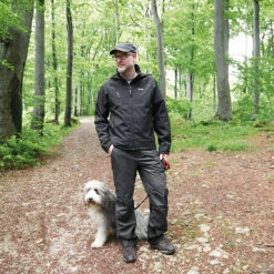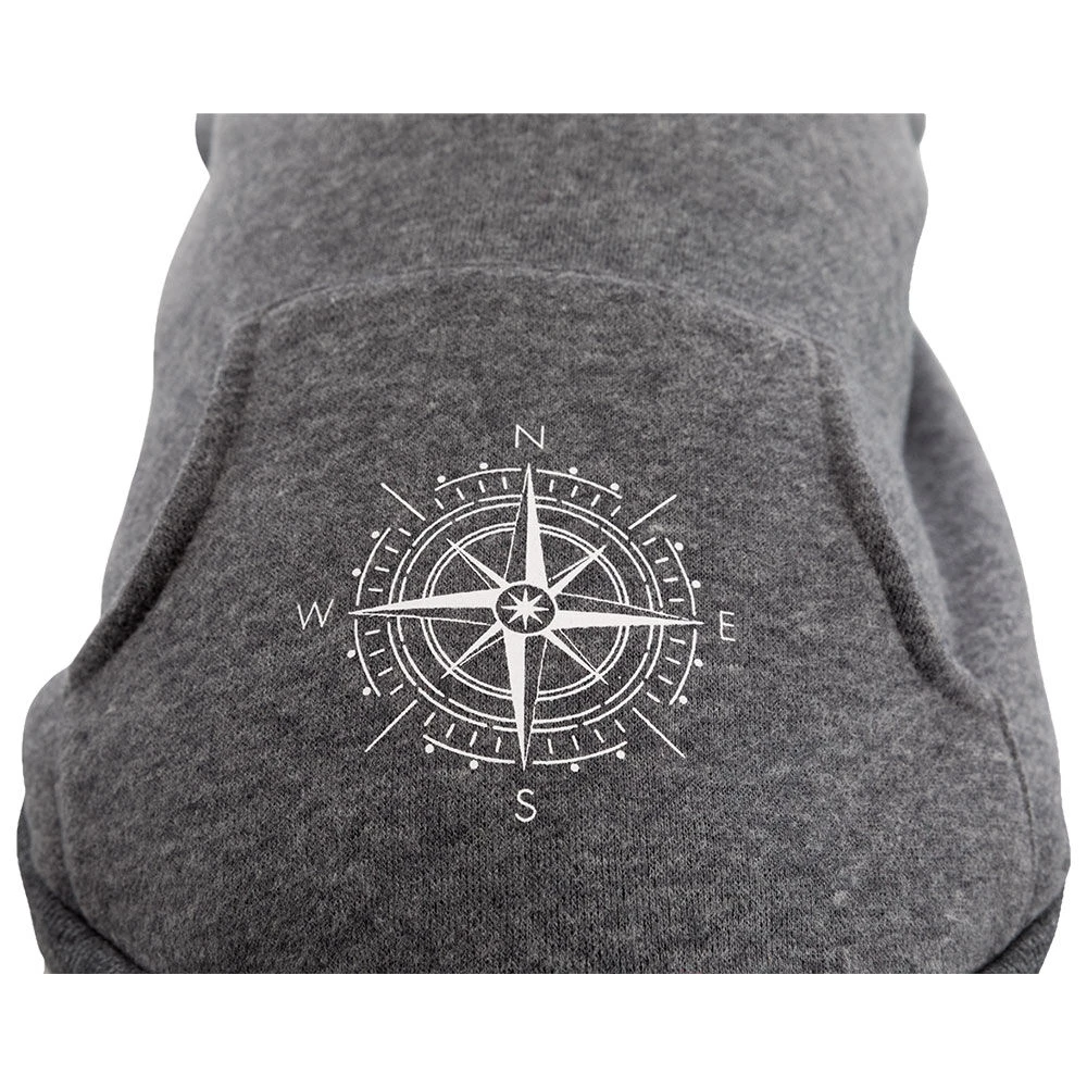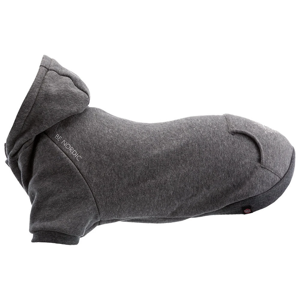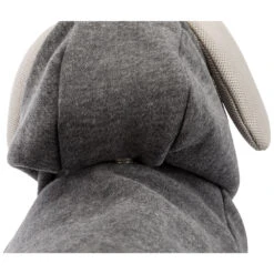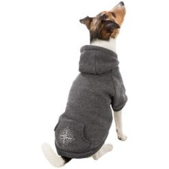 Modieuze trui met capuchon en klittenbandsluiting bij de buik. Met een drukknoop kan de capuchon vastgezet worden. Een warme hondentrui met een opgeruwde, zachte binnenkant.