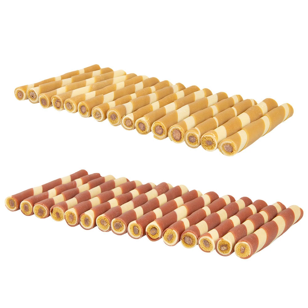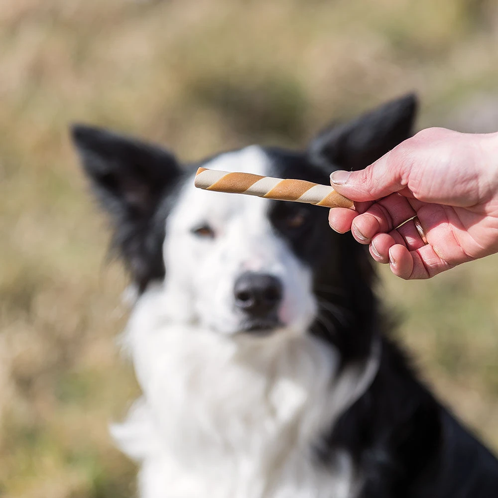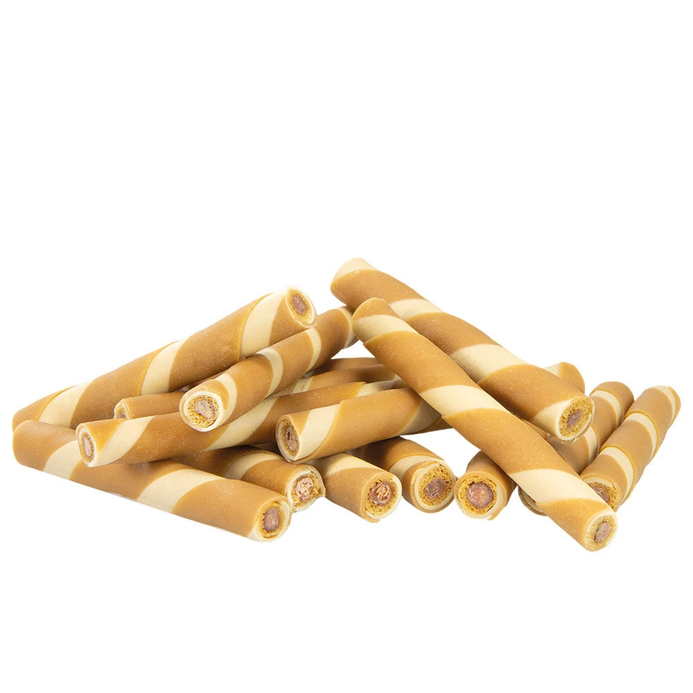 Lekker ruikende rolletjes met 3 verschillende lagen. Een taaie laag omringt een tweede laag losser deeg. Binnenin zit een hele harde kern van heerlijk vlees. Een heerlijke, vetarme traktatie voor kleine tot middelgrote honden. De glutenvrije rolletjes zijn gemaakt van zoete aardappel en andere groenten. Ze zijn graanvrij en bevatten bovendien ruim een kwart heerlijk vlees van slechts één diersoort (monoproteïne). Omdat ze gemaakt zijn zonder toegevoegde suiker en zonder runderhuid, zijn deze rolletjes ook een heerlijk tussendoortje voor gevoelige honden.