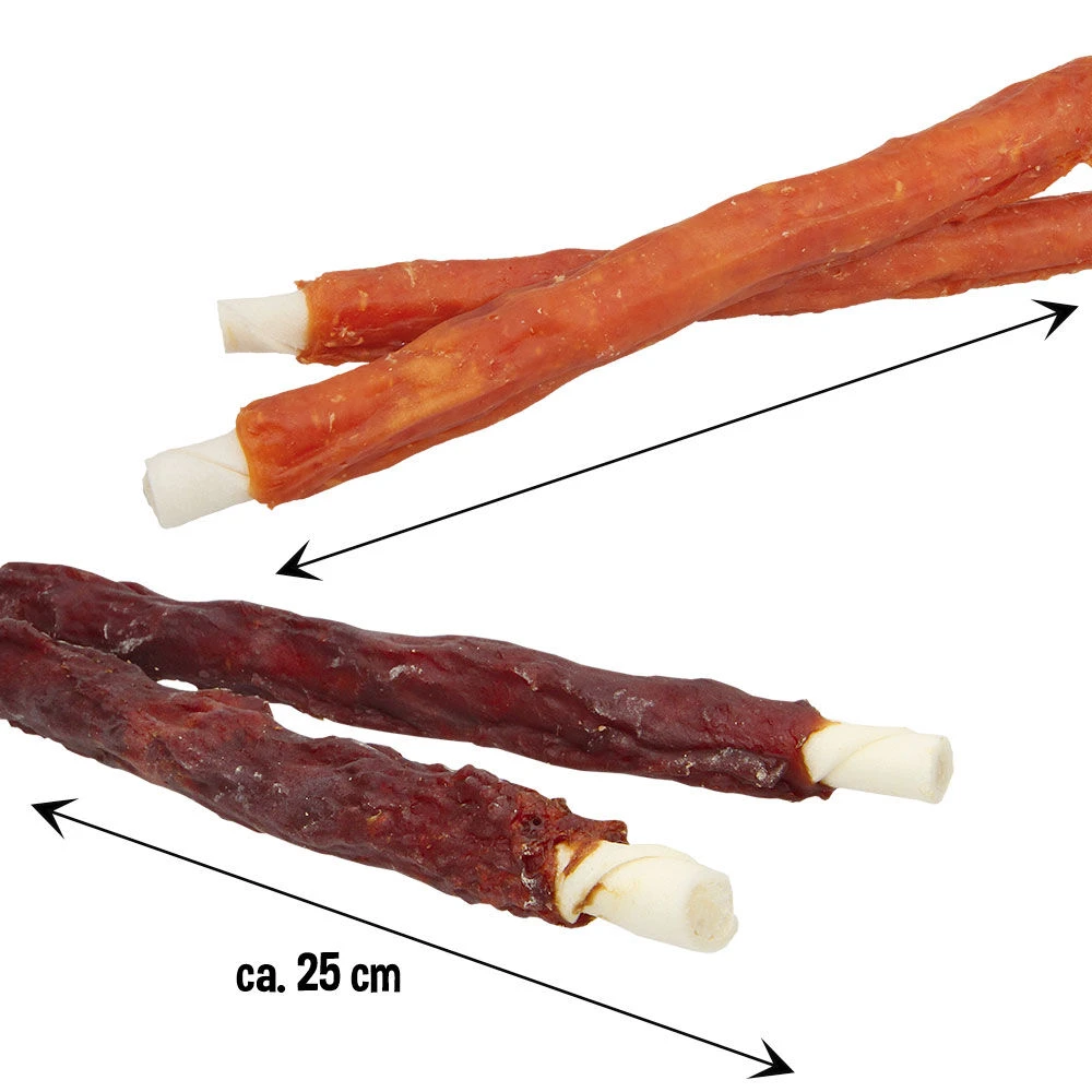Grote, dikke kauwstaven van buffelhuid omwikkeld met veel filet. Een heerlijke kauwsnack voor middelgrote tot zeer grote honden.