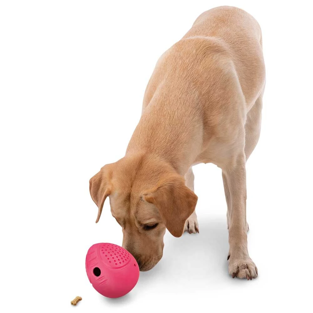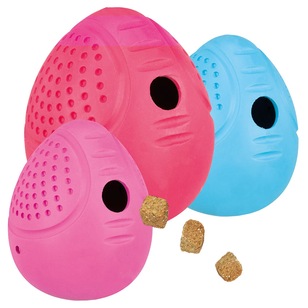 Een rollend, stuiterend speelei van natuurrubber. Gaat vanzelf steeds weer rechtop staan, zodat niet alle brokjes tegelijk uit de opening vallen. Zo is extra lang speelplezier gegarandeerd. Met kleine lekkernijen te vullen.