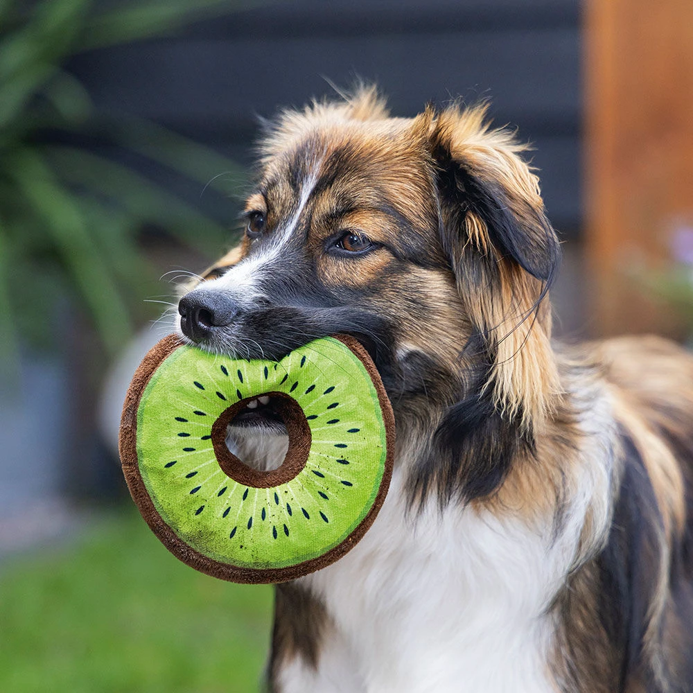De Fruity Donuts met de look van een kiwi, citroen of meloen geven uw hond veel speelplezier. De knuffel heeft veel te bieden. Gooi hem als een frisbee en laat uw hond er achteraan jagen. De knisperende folie aan de binnenkant zorgt voor nog meer plezier en spanning. De kleine pieper stimuleert bovendien het speelinstinct. Ook kan uw hond heerlijk tegen het zachte pluche aan gaan liggen. Klein maar fijn en heel licht, ideaal voor kleine tot middelgrote honden.