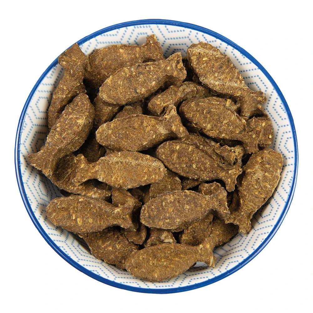 Hard gedroogde hondensnacks van gemalen en gedroogde kabeljauwfilet. Zonder additieven.