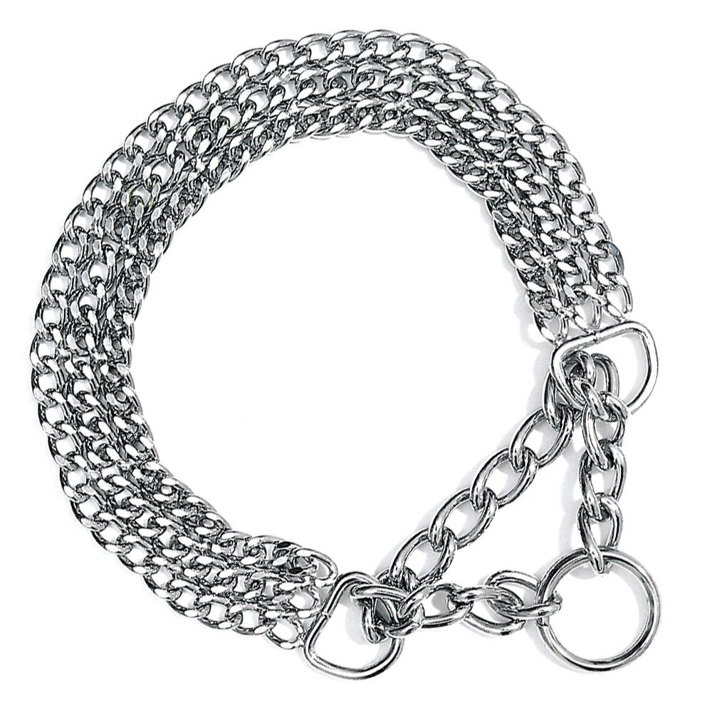 Onze dubbele en drierijige halskettingen hebben een ‘gedeeltelijk wurgeffect’, wat betekent dat de ketting slechts tot aan de stop aangetrokken kan worden, op deze manier kan de hond niet meer uit de ketting glippen en wordt ook niet meer gewurgd.