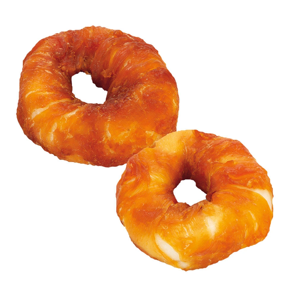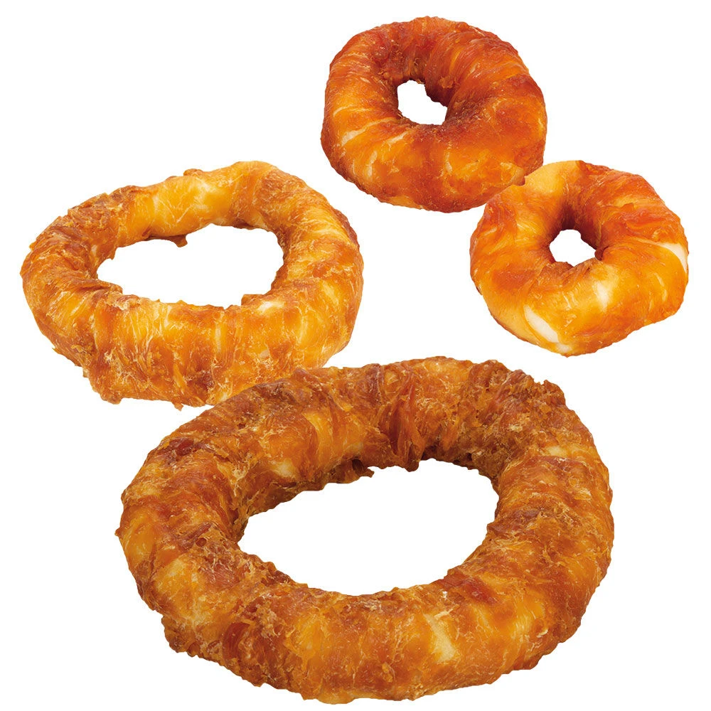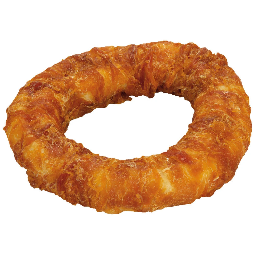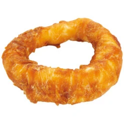 Dikke ringen van runderhuid, omwikkeld met heerlijk kippenvlees. Deze snack is zeer geliefd bij honden. Met smaak zal uw hond eerst de kip van de ring halen, om vervolgens lange tijd op de dikke ring te gaan kauwen. Een perfecte kauwsnack! Kies een afmeting die bij uw hond past.