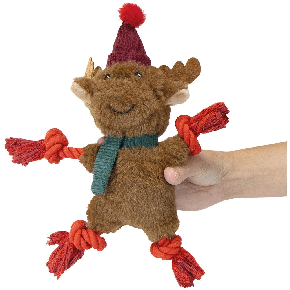 Zacht, hoogpolig pluche. Doorlopende, geknoopte touwen in het lichaam (dus sterk, want touwen kunnen niet breken). Vilten gewei, pieper in de kop, knisperfolie in kop en lijf, corduroy muts en sjaal.