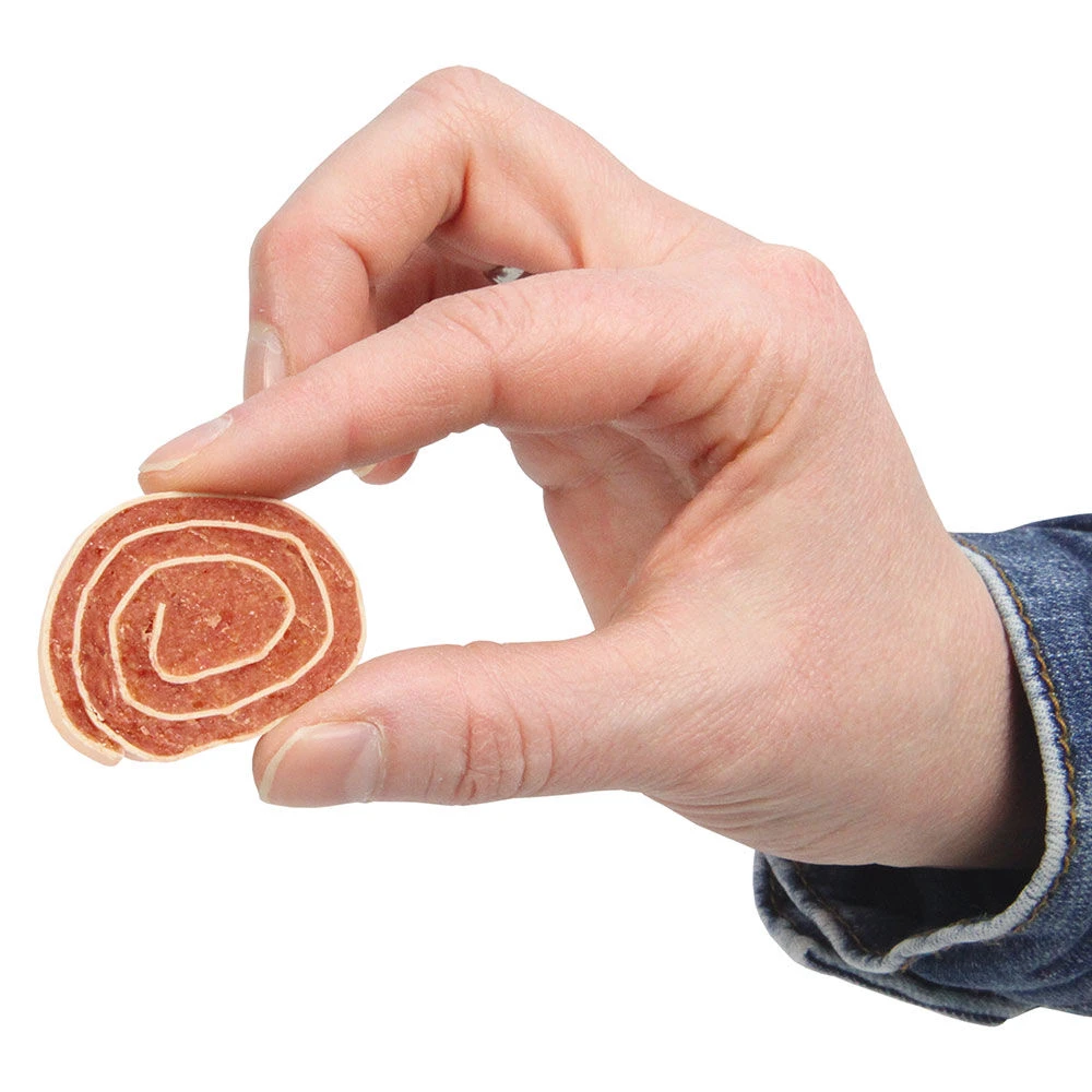 Een prachtig gerolde slak van vers kipfiletvlees met echte koolvis. In de oven veilig met warme lucht gedroogd, vetarm, fijn en lekker.