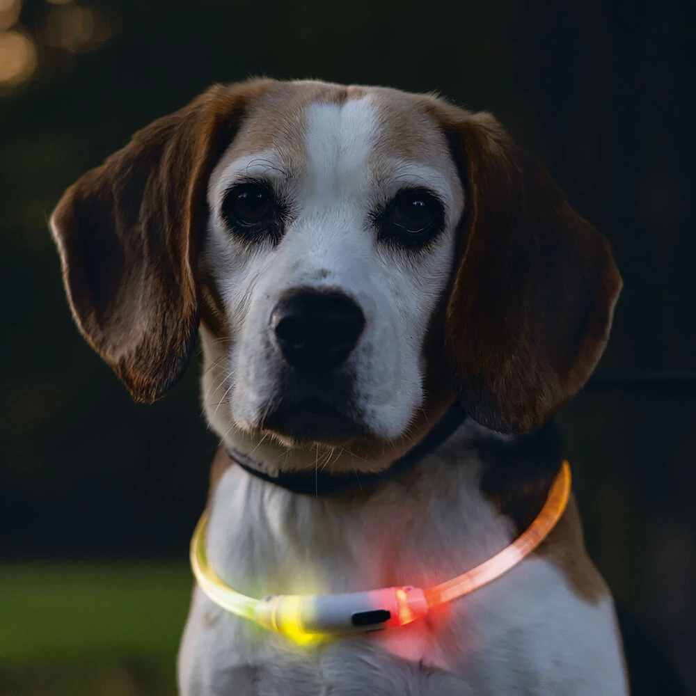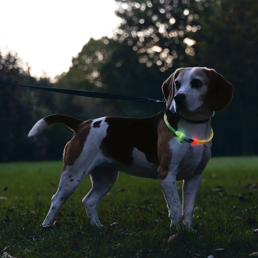 Met deze felgekleurde halsring is uw hond rondom goed zichtbaar. Het licht reikt tot op een afstand van 500 m! De led-lichtslang heeft een oplaadbare accu, die via USB (inclusief kabel) middels een computer of een stopcontactadapter opgeladen kan worden. De slang is extreem licht en waterbestendig. Knipperend of continu licht zijn instelbaar. Al naargelang de halsomtrek kan de ca. 70 cm lange slang naar wens ingekort worden.