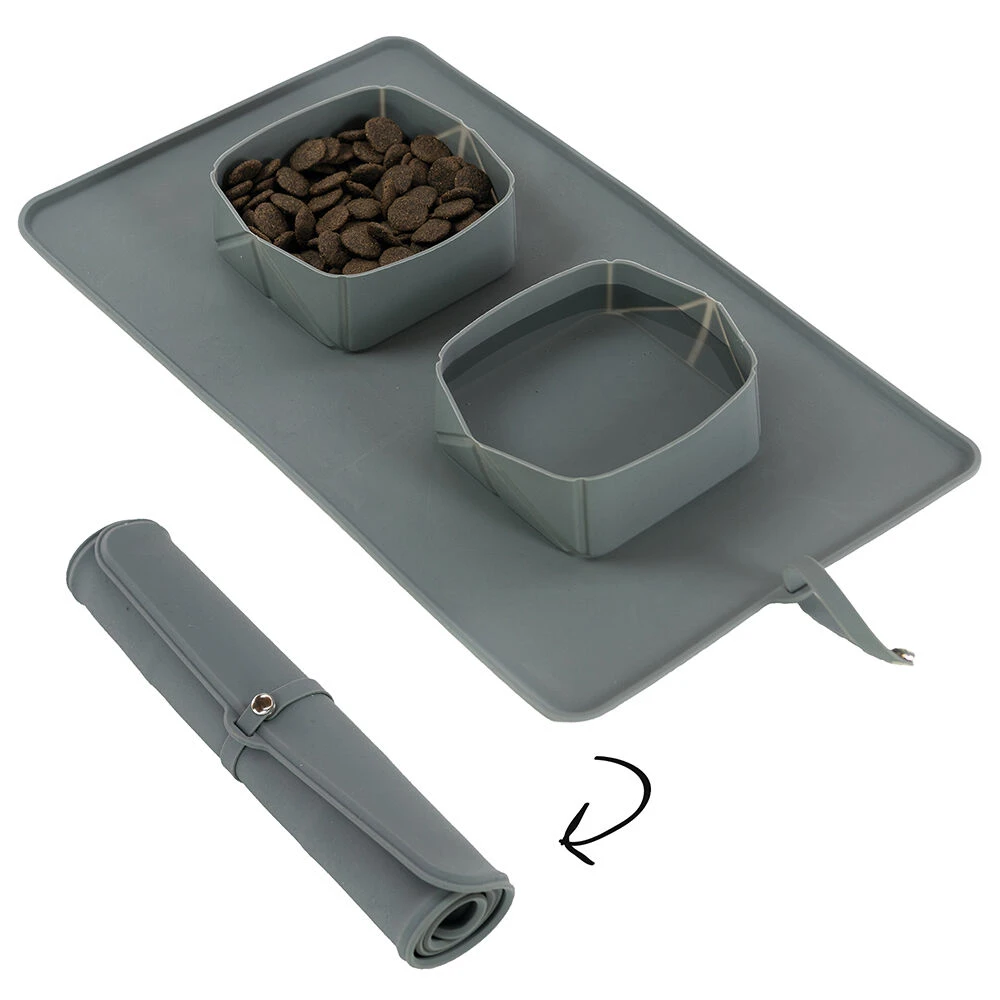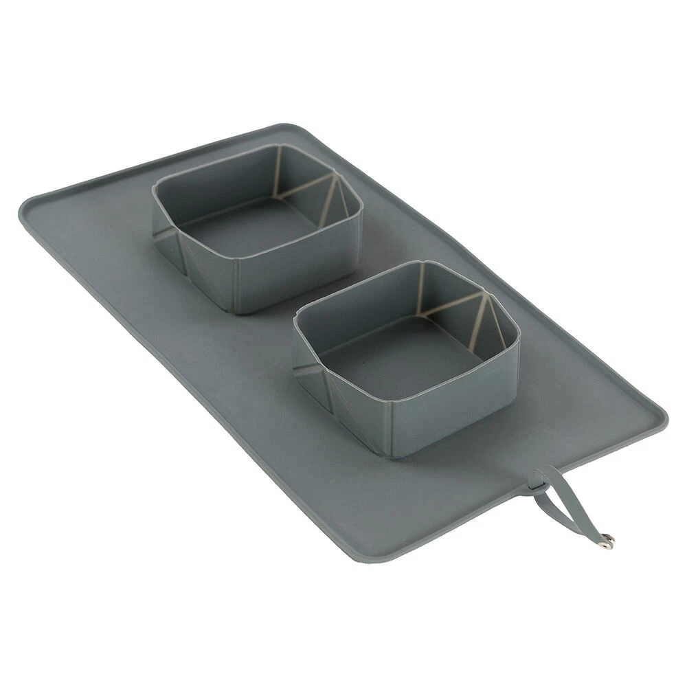 Praktische dubbele voer- en drinkbak met geïntegreerde placemat. Na gebruik gewoon ruimtebesparend op te rollen! Ook ideaal voor onderweg. Van hygiënische silicone. Met 2 bakken van 11×11 cm (elk 600 ml). Vaatwasserbestendig!