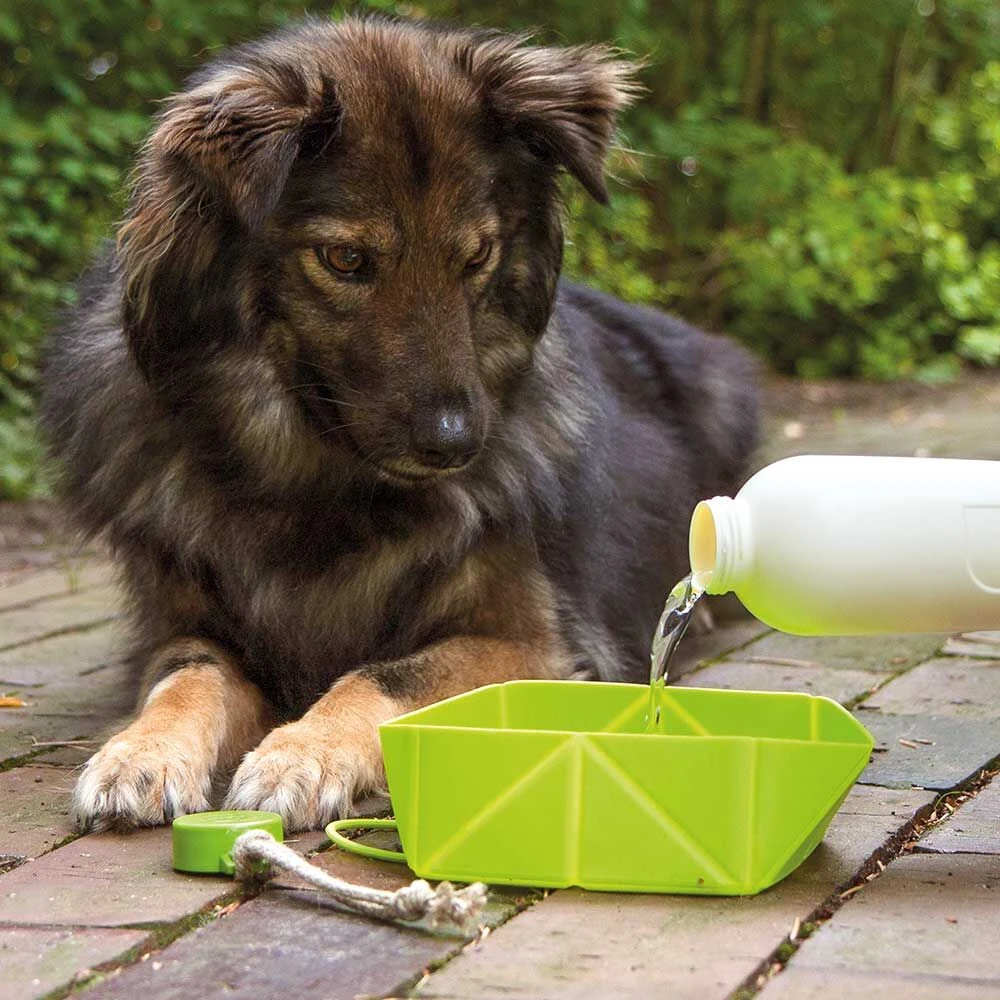 Praktische, kleine, opvouwbare voerbak voor onderweg. Klein op te vouwen. De ophanglus houdt de hygiënische voerbak tegelijkertijd opgevouwen.