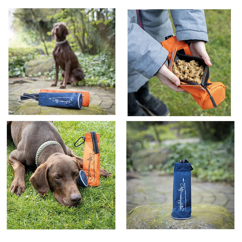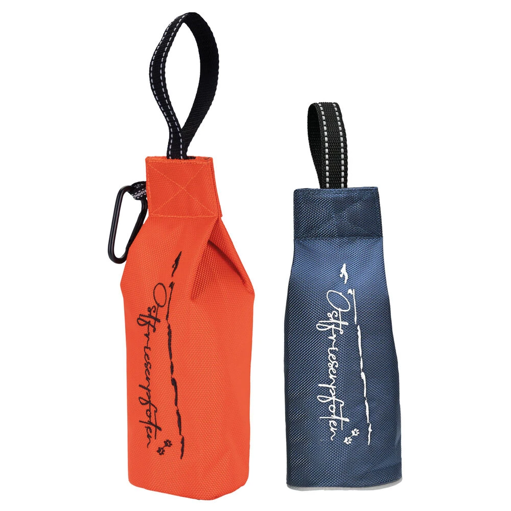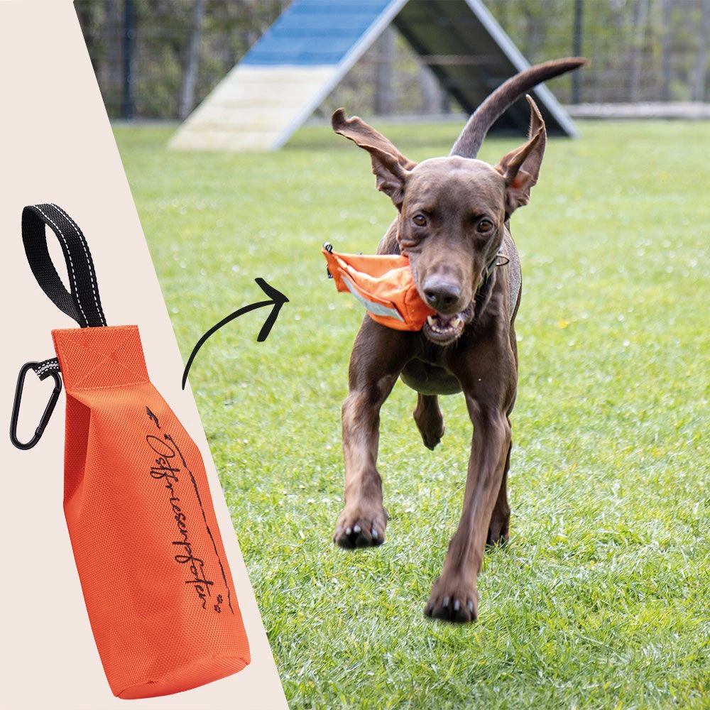 De stof is gemaakt van 1680D-polyester voor een hoge duurzaamheid en lange levensduur en heeft versterkte naden en een stevige, veilige rits. Een praktische karabijnhaak maakt het gemakkelijk om het aan riemlussen of tassen te bevestigen – ideaal voor op reis. Dankzij de verborgen ritssluiting en het ontbreken van metalen oogjes is de kans op verwondingen bij uw hond minimaal. De reflecterende strip maakt de dummy zichtbaar, ook als het wat donkerder is. Het stijlvolle ontwerp wordt afgerond met een hoogwaardig logoborduursel.