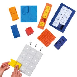 Druk de betreffende klem samen onder de bodemplaat totdat de puzzel er bovenaan uitspringt. Veilig spelen vereist een stevige grip en dus een beetje druk bij het loslaten.