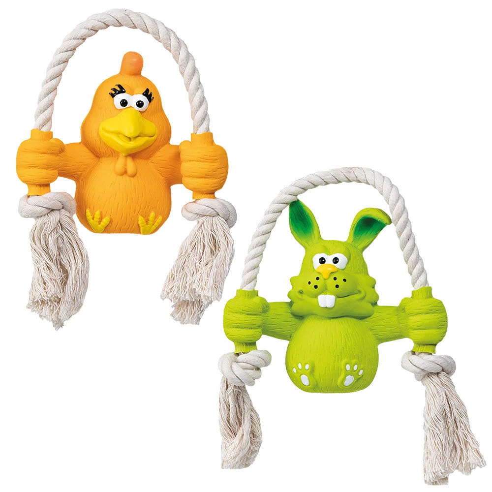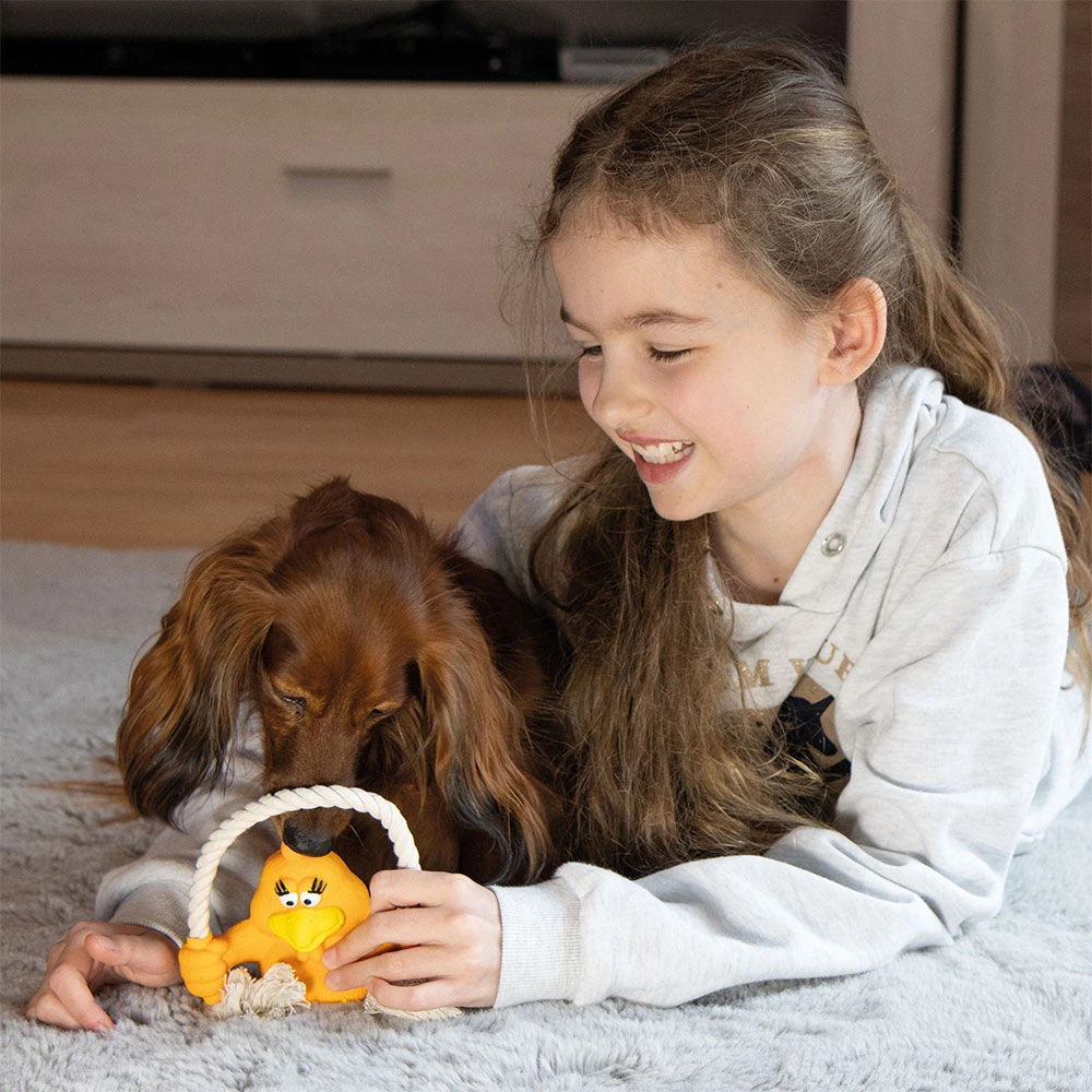 Dit leuke latex-speeltje bezorgt uw hond veel speelplezier! Hij kan het speeltje aan het katoenen touw vasthouden, eraan trekken of erop kauwen. Hierdoor wordt ook gelijk het gebit gereinigd. De zachte pieper binnenin stimuleert de drang om te spelen. Geschikt voor kleine tot middelgrote honden.