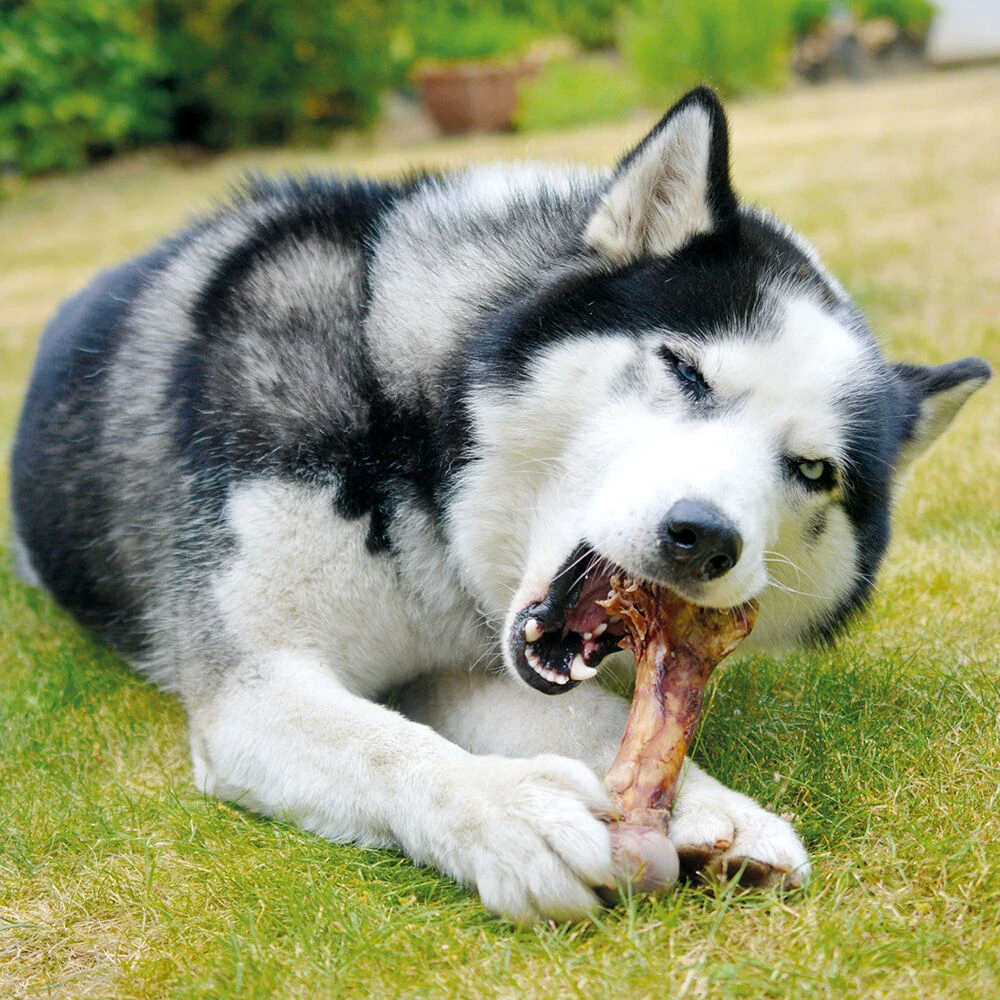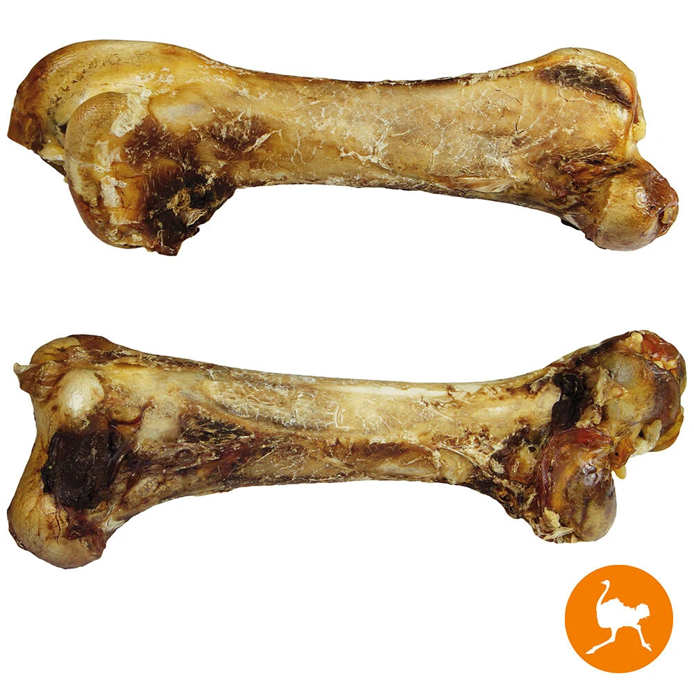 Een echt bot van het bovenbeen van de Afrikaanse struisvogel. Dikke, ca. 30 / 50 cm. lange botten, met hier en daar nog spier en vlees stukjes. Ideaal voor sensibele honden, is alleen maar lang gedroogd en niet gerookt.