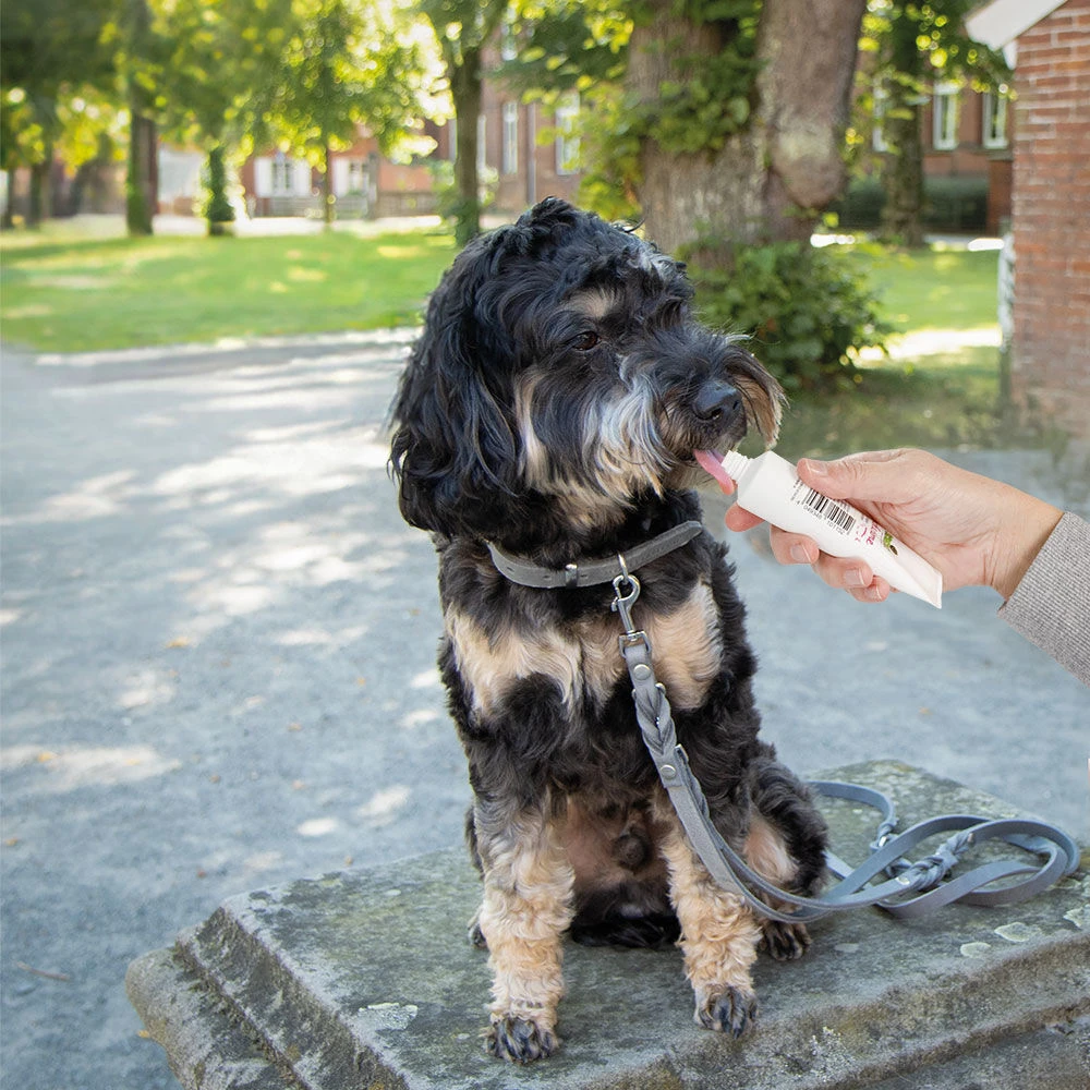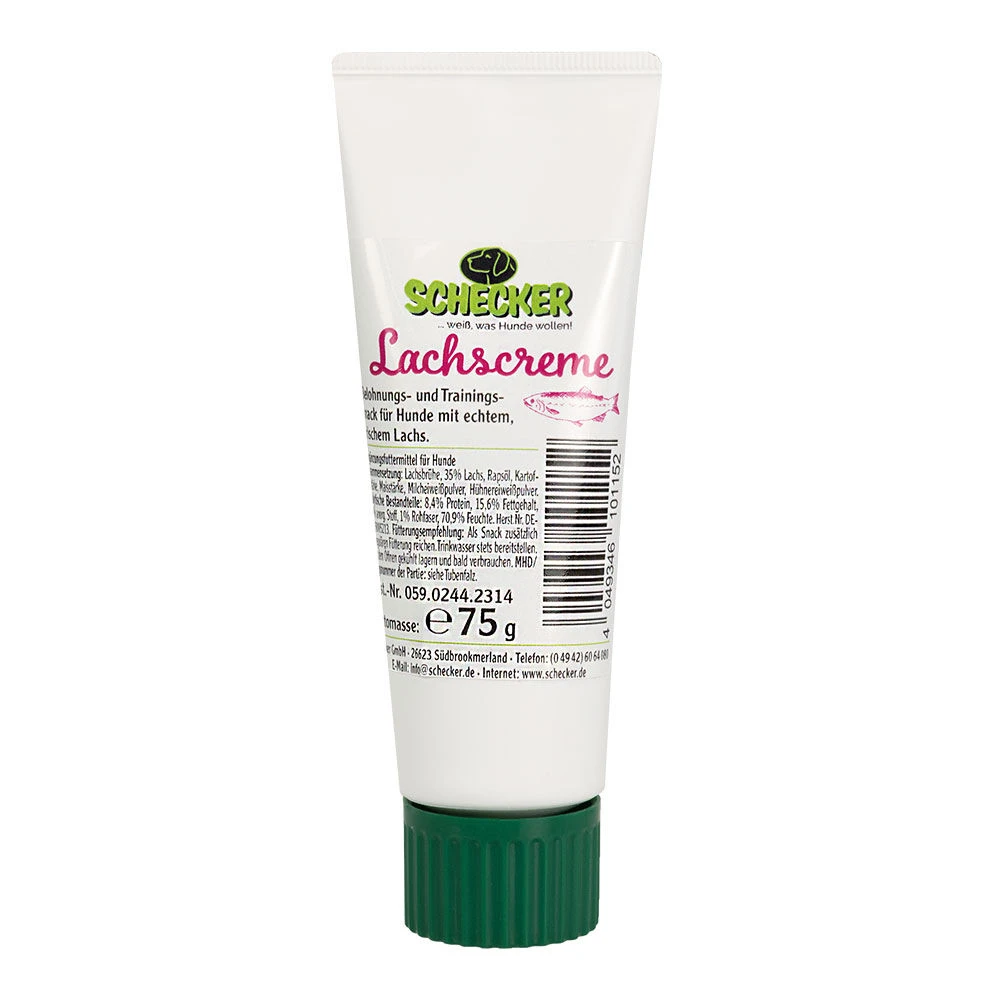 Heerlijk crèmige belonings- en trainingssnack voor honden. Van vers zalmvlees, met raapolie en andere fijne ingrediënten. Helemaal zonder conserveringsmiddelen of andere toevoegingen! Schecker-zalmcrème is de perfecte liksnack voor op het trainingsveld, voor het uitlaten of gewoon voor tussendoor. Een beetje afwisseling voor uw kleine viervoeter en zeer praktisch in gebruik!