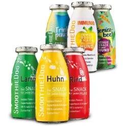 - SmoothieDog 6-er MIX (6x 250 ml) = (je 1x kip, lam, rund, drinkpauze (eend), SmoothieDog moestuin (vegetarisch), SmoothieDog IMMUNIO (fruit, groentem, rund)