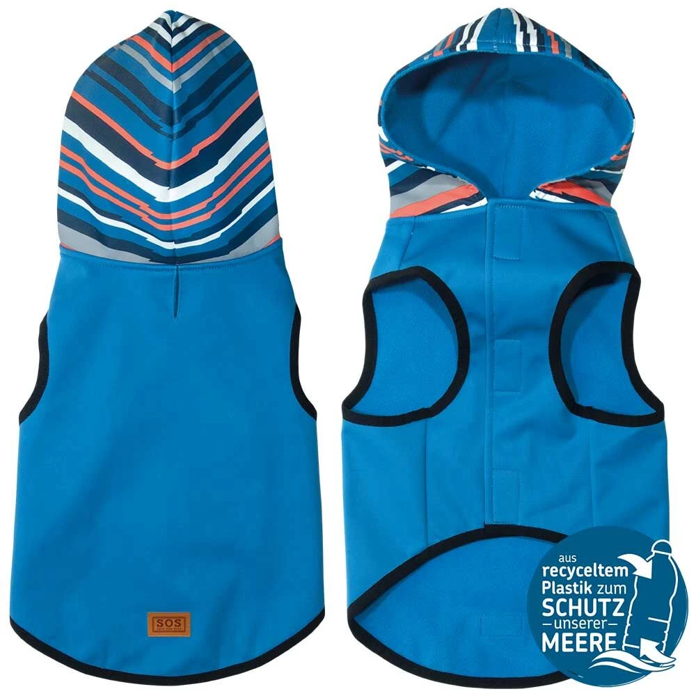 Een lichte hondenjas van fijne, gemakkelijk te onderhouden en waterafstotende RPET-polyesterstof met gekleurde capuchon. De perfecte windbescherming voor uw viervoeter. Een eenvoudig, maar modern, vlot en vooral ook functionele jas voor de steeds langer wordende tussenseizoenen. Deze zachte windbreaker-jas wordt voor bijna 100% gemaakt van RPET-stoffen en garen. De grondstof RPET wordt gewonnen uit ingezamelde en gerecyclede kunststof pet-flessen, die voor deze hondenkleding worden gebruikt en die zo perfect worden gerecycled.