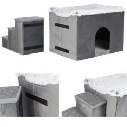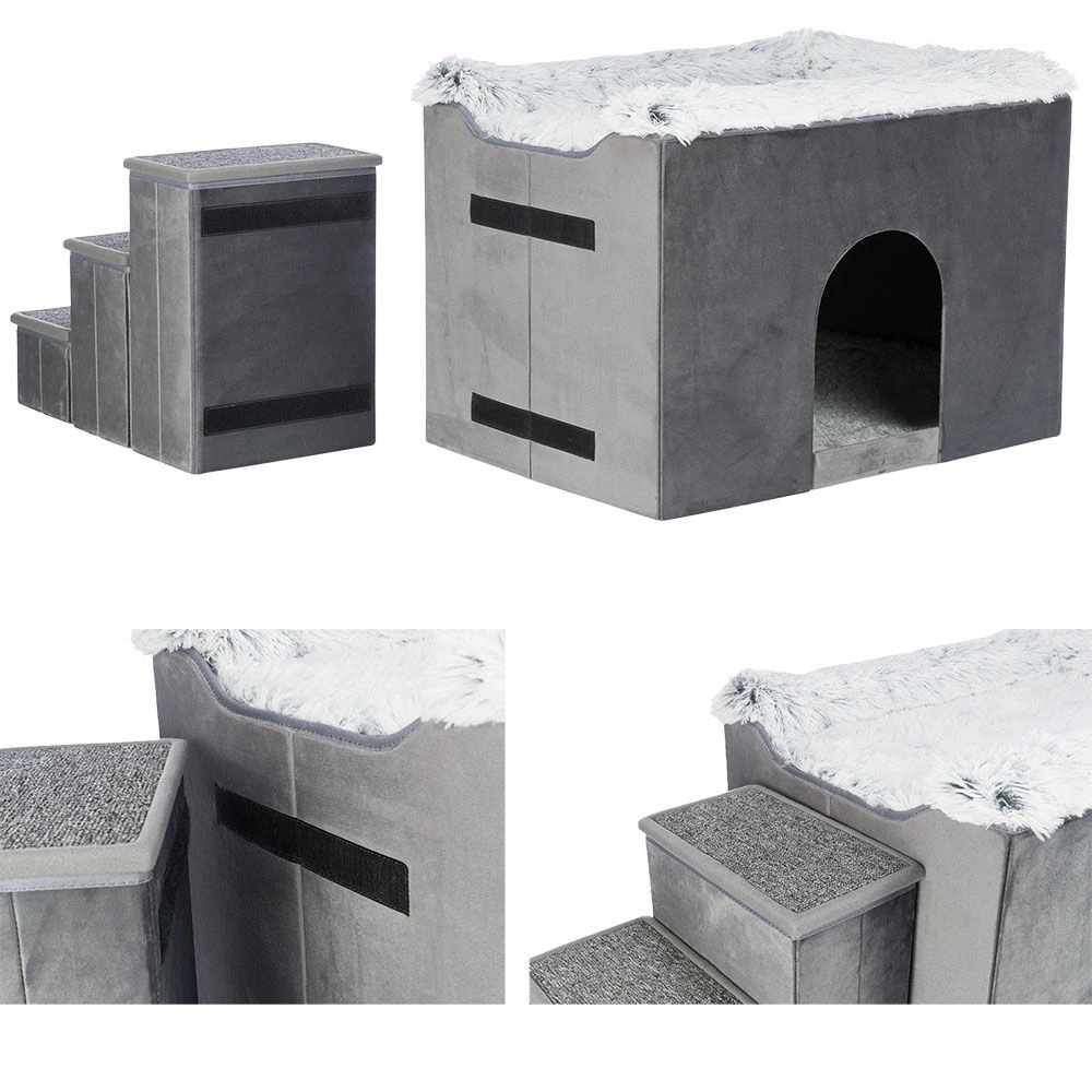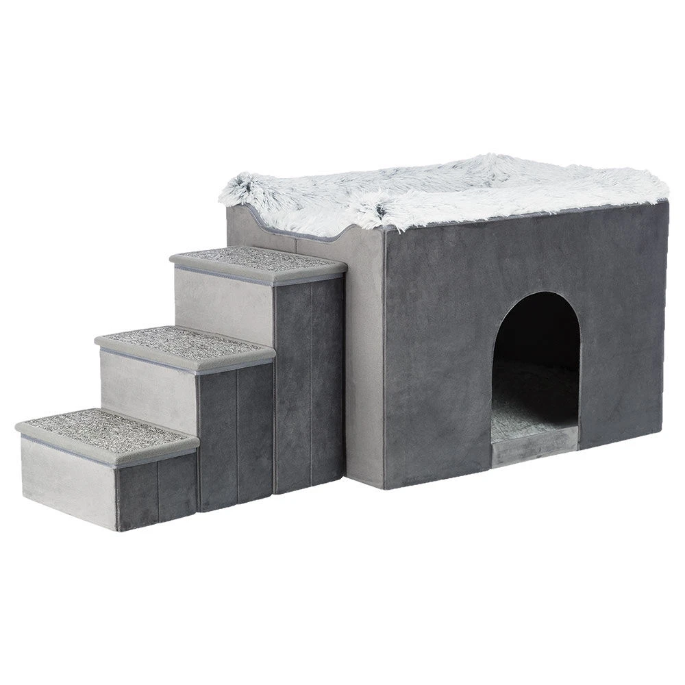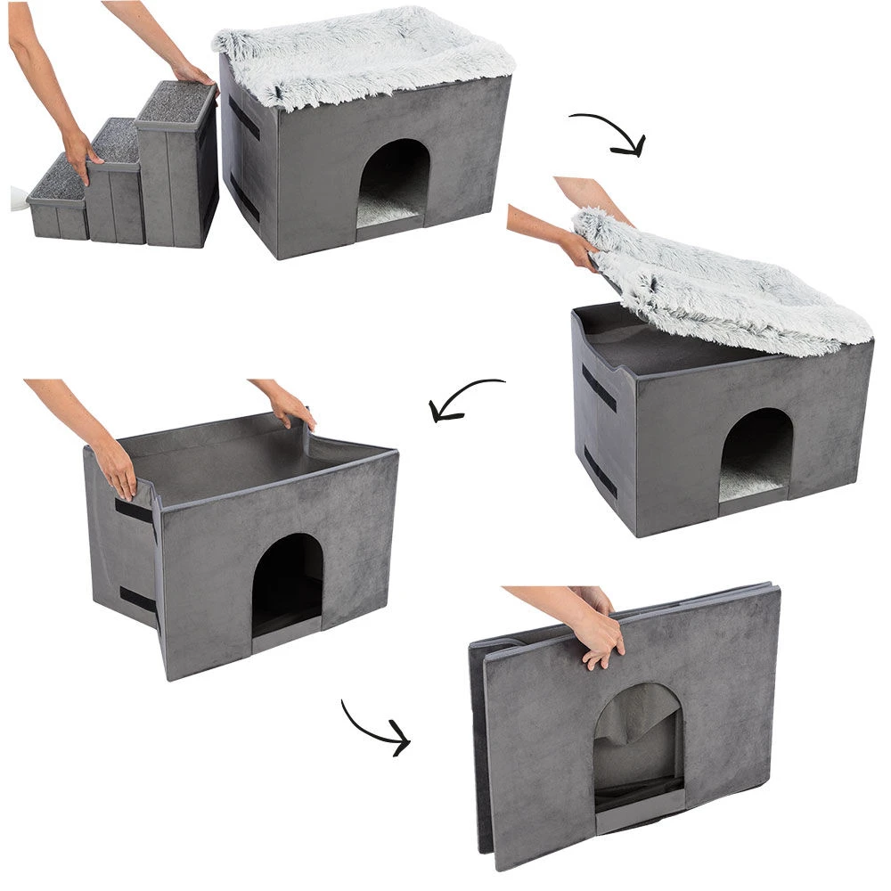 Volledig inklapbare appartementenkennel met 2 slaapgedeeltes (boven en binnen) en trap met 3 treden. (Beide kunnen ook afzonderlijk worden gebruikt.)