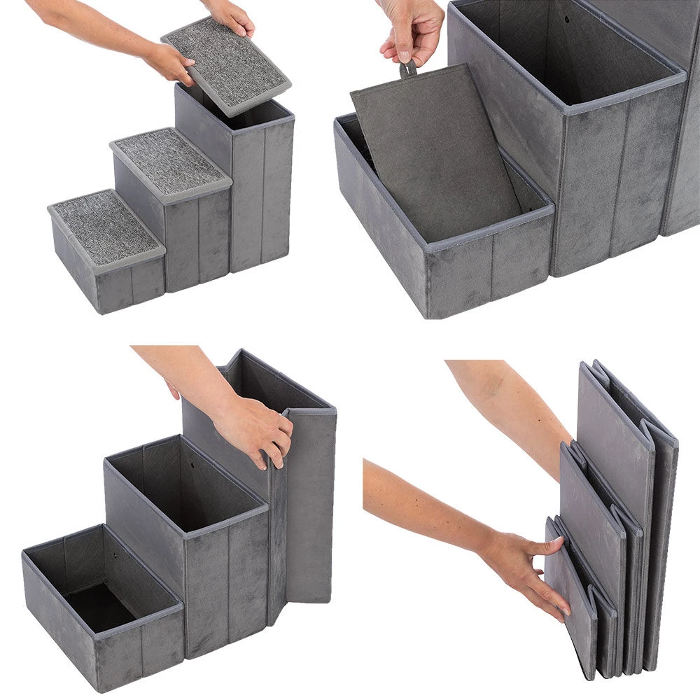 - Stabiele, niet wiebelende trap met 3 treden voorzien van antislip vloerbedekking.