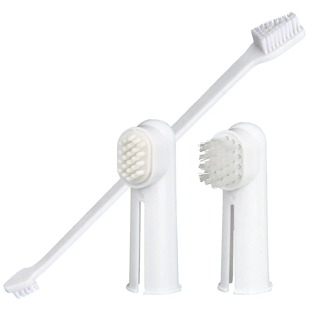Eindelijk een set die alles bevat wat u voor de gebitsverzorging van uw lievelingsdier nodig heeft: tandpasta met munt, die zorgt voor een frisse adem en de tanden van uw hond reinigt, twee vingertandenborstels, één voor het masseren van het tandvlees en één voor het poetsen van de ruimten tussen de tanden, een dubbele tandenborstel met een kleine opzetborstel voor de kiezen en een grote opzetborstel voor de voortanden.