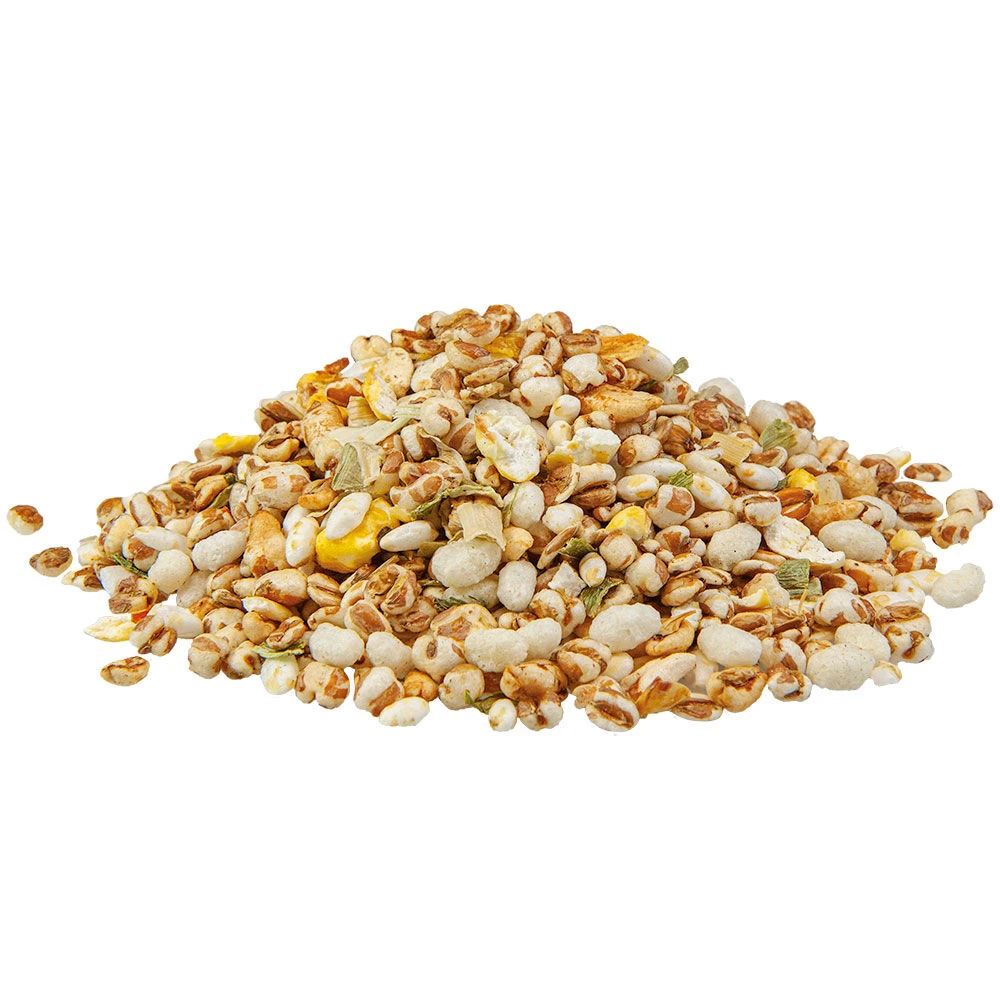Deze energieke delicatesse van gepoft volkorengraan zoals tarwe, maïs en gerst, zoete maïs, gepofte rijst, gedroogde wortels, erwten en prei geeft ieder vleesgerecht net dat ‘beetje extra’ en is ideaal bij verse pens, nat blikvoer of andere vleesgerechten. Net zoals alle DOGREFORM-producten zijn ook deze graanvlokken zuivere natuurproducten en helemaal vrij van alle kleur-, lok- en geurstoffen.