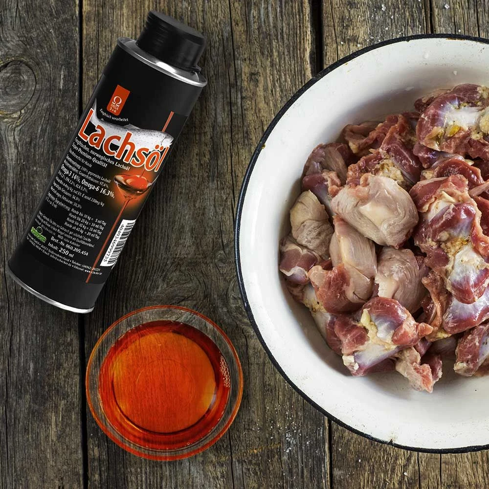 Verse, Noorse zalmolie in premium-kwaliteit. OMEGA 3 + OMEGA 6. Bevat de belangrijke vetzuren EPA, DHA en ALA.
